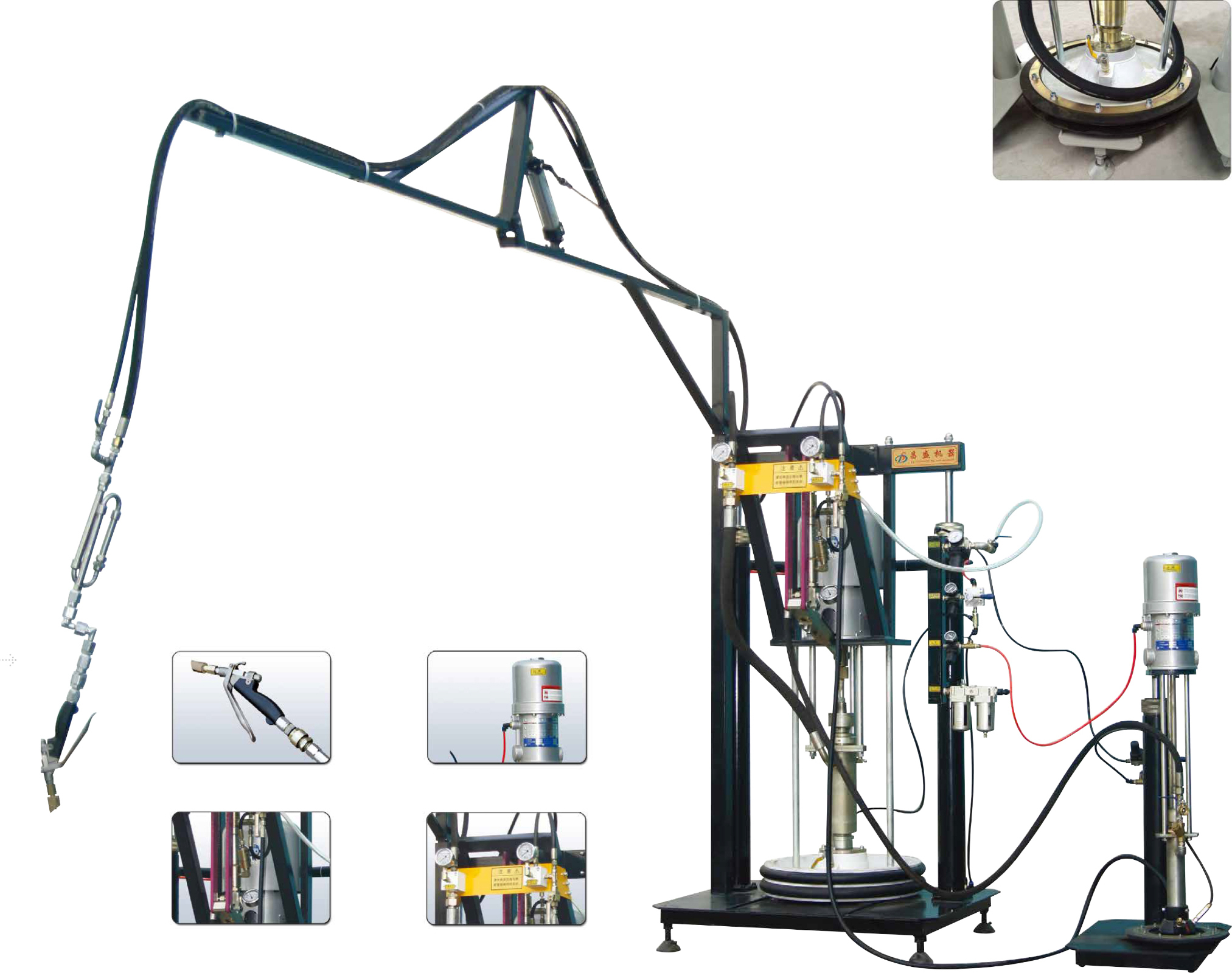 该机广泛适用于聚硫胶、聚氨脂胶、硅酮结构胶等精确配比。均匀混合和快速喷涂作业的场合,是理想的玻璃粘接生产设备。采用原装进口气动马达及专用射胶枪.并且带有胶枪辅助系统,操作更轻便快捷,适合大规模中空玻璃和幕墙的生产。